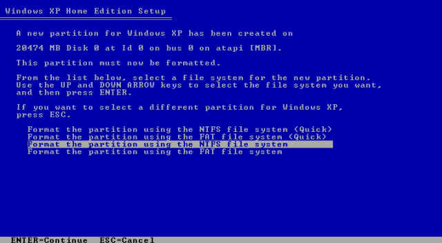 8. Choose your desired format for the partition space. I would recommend NTFS for its additional features. You have the option for either a quick or full format. A quick format does not scan the disk for bad clusters and installs. A full format first scans the hard drive for errors and does not write over those spots, so I would recommend the full format.