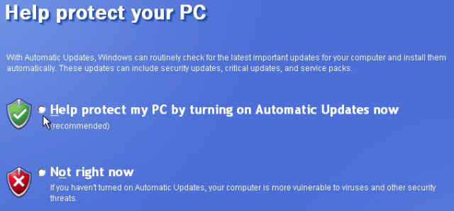 21. Choose whether or not you wish to have XP automatically install updates, which I recommend and click Next.