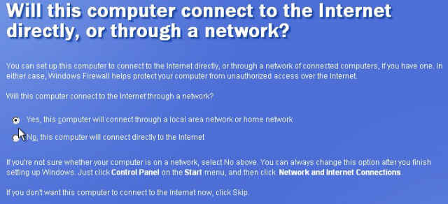 22. Choose the type of connection you have to the Internet. If your PC is directly connected to your modem or phone line, click "No..." If it is on a home network (wireless or wired), click "Yes..." and press Next.